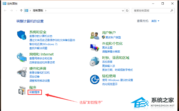 2. 在控制面板中找到程序,点击下方的“卸载程序”。