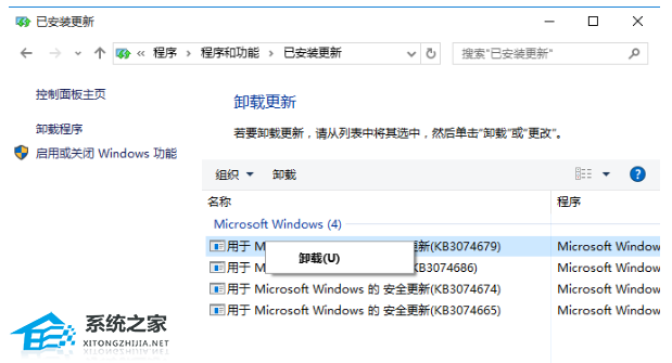 4. 这时系统会列出已经安装的更新,右键点击要删除的更新,再点击“卸载”即可。