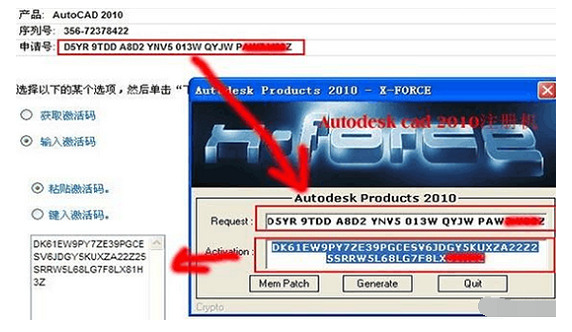3、然后点击启动注册机,在“request”中粘贴我们刚刚复制的申请码,首先鼠标点击“patch”,再点击“generate”,接下来将会出现一个cad2010激活码,选中并复制激活码,返回autocad2010界面。将激活码粘贴至autocad2010激活界面,点击下一步,即可完成激活。