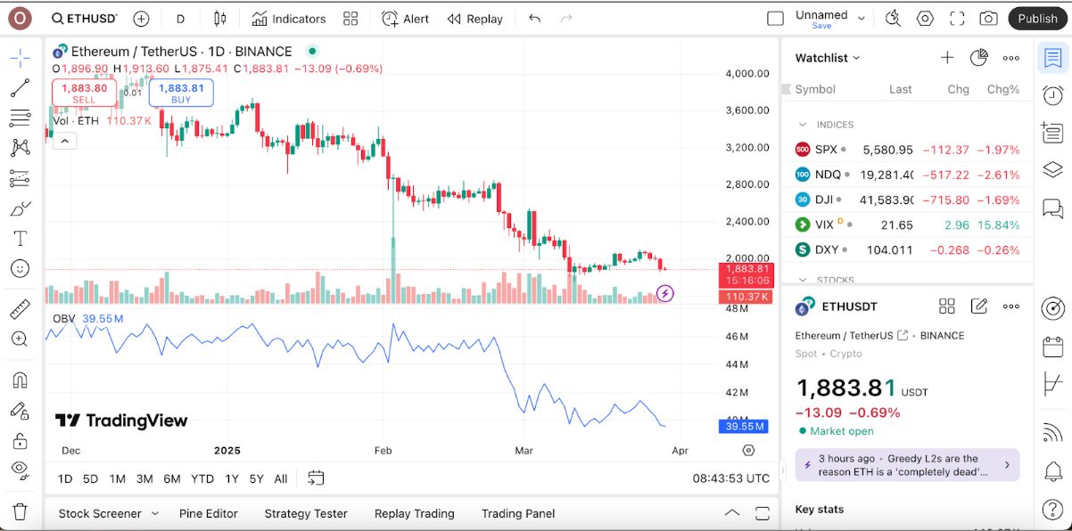 以上的 ETH/USDT 图表显示,以太坊处于持续下行趋势,价格从 2,500 美元以上跌至约 1,800 美元。在此期间,OBV 曲线也同步下滑,表明市场受卖压推动。价格走势与 OBV 方向一致,验证了空头动能,显示出市场目前仍由卖方主导。