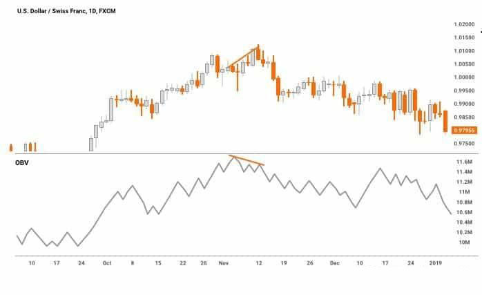 下面的例子,当价格正在创造更高的高点,但OBV标志着更低的高点,你很有可能看到价格反转。然而,不建议立即交易这种信号。最好的事情是添加一个振荡器来帮助你确认你的进入。