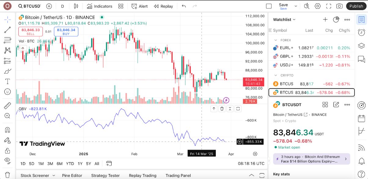 在这一轮上涨之后,图表显示比特币价格开始在约 80,000 美元附近进入盘整阶段,也就是说蜡烛图的形态趋于收敛,交易量也减弱。在这种情况下,OBV 曲线趋于平缓,表明买卖双方的力量大致相当。这通常意味着市场缺乏明确方向,交易者可能会将此视为观望信号,等待更明确的走势再做决定。