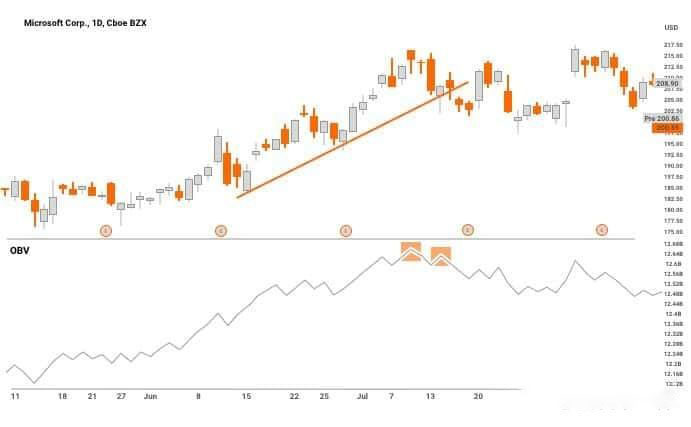 相反,如果价格在上涨,而 OBV 却在下降(这被称为“负背离”),则可能意味着当前的上涨动能正在减弱,趋势有可能发生反转。此外,当价格下跌且 OBV 同样下降时,通常确认了市场处于下跌趋势中;而如果出现“正背离”(即价格下跌但 OBV 升高),则可能预示着即将出现的上涨行情。