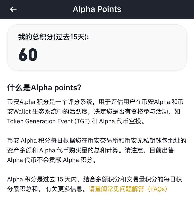 Alpha 积分是过去 15 天内,结合余额积分和交易量积分的每日积分累积总和。 有关更多信息,请查阅常见问题解答(FAQs)