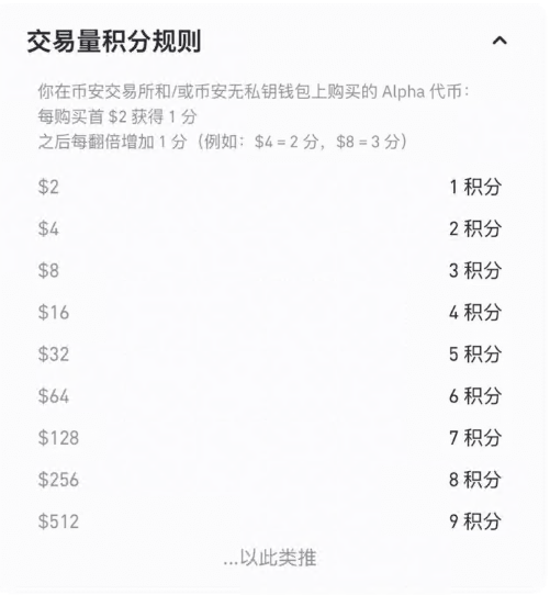 根据用户每日买入Alpha代币的交易额(美元),积分按以下规则计算: