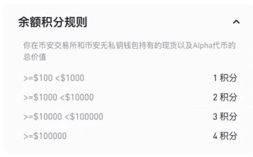 资产积分包括在币安中心化交易所和币安钱包中持有的总资产。其中,中心化交易所资产仅限于所有账户中已上币安现货的代币以及Alpha账户中的资产;币安钱包资产仅限于Alpha代币和已上币安现货的代币。其他未在Alpha区展示以及未能在币安现货市场上交易的代币,例如 LSD 代币,均不被视为合格资产。