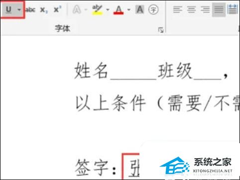 4、点击开始中的U图标(下划线图标),给名字增加下划线。