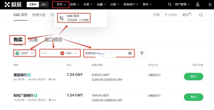 8、进行交易前需要拥有USDT,可在C2C买币进行交易,根据需求选择合适商家,点击“购买”,而后根据提示进行付款、等待商家放币(若是长时间没有收到币种,可联系客服进行处理)
