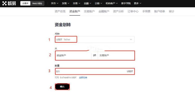 10、选择币种,以【USDT】为例—从【资金账户】—到【交易账户】—输入划转【数量】—【确定】。