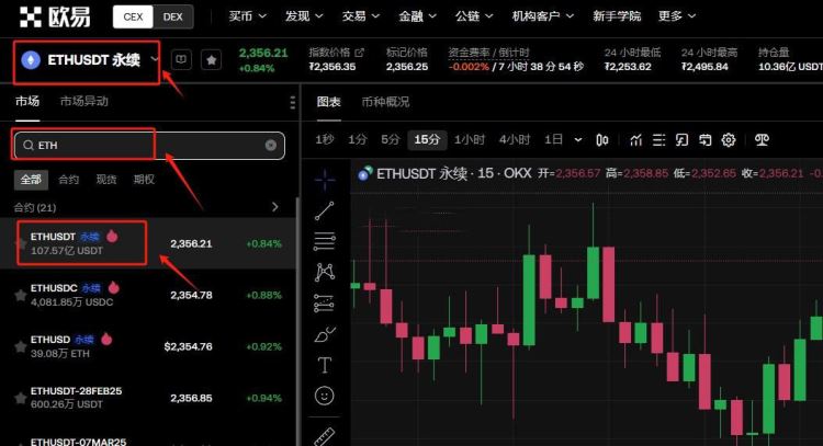 13、以ETH/USDT杠杆交易为例:点击官网首页左上方【交易】—【杠杆合约交易】— 进入交易页面,点击左上角币对框【ETHUSD永续】;在新页面下点击切换交易模式—【杠杆】—【USDT】—选择【ETH/USDT】。