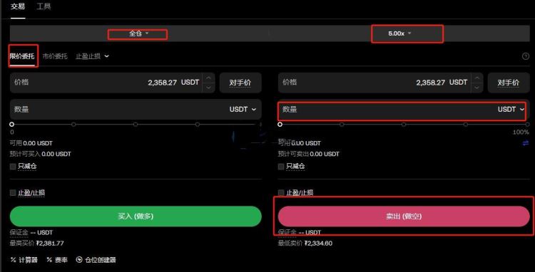 14、选择【全仓/逐仓】、【USDT保证金】、【杠杆倍数】、【限价委托】— 输入【价格】、【数量】或者【金额】—点击【卖出(做空)ETH】—【确认】。