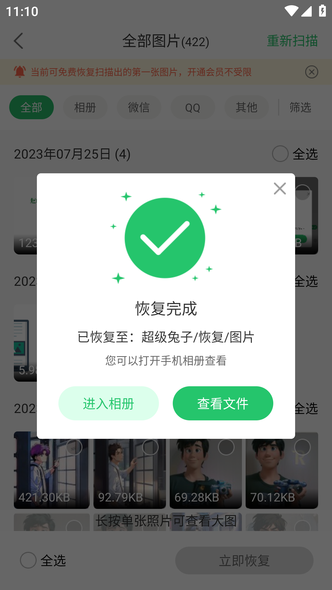 6、提示恢复完成后,可点击查看已恢复的内容。