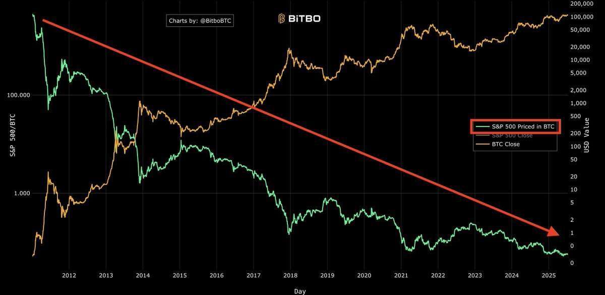 事实上,《The Kobeissi Letter》在其分析中指出,以比特币计价的标普 500 指数今年迄今已下跌 15%,自 2012 年以来更是暴跌 99.98%。