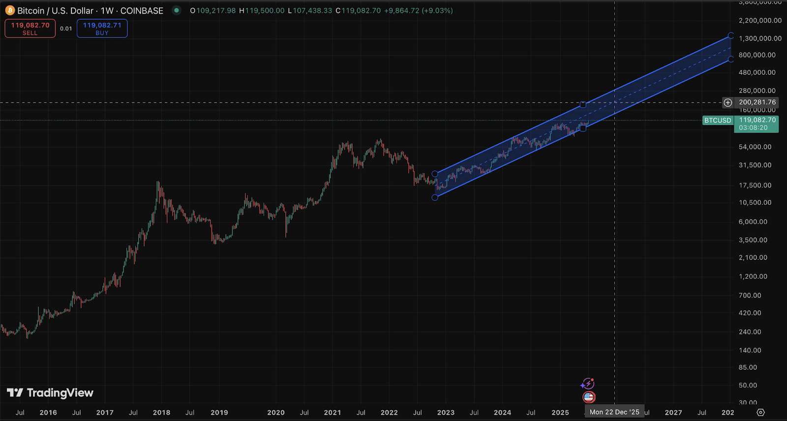 比特币目前正在上升通道内震荡上行,预测显示其价格有望在 2025 年 12 月前冲上 $200,000+ 美元,且随着价格走高,指数级加速将同步展开。