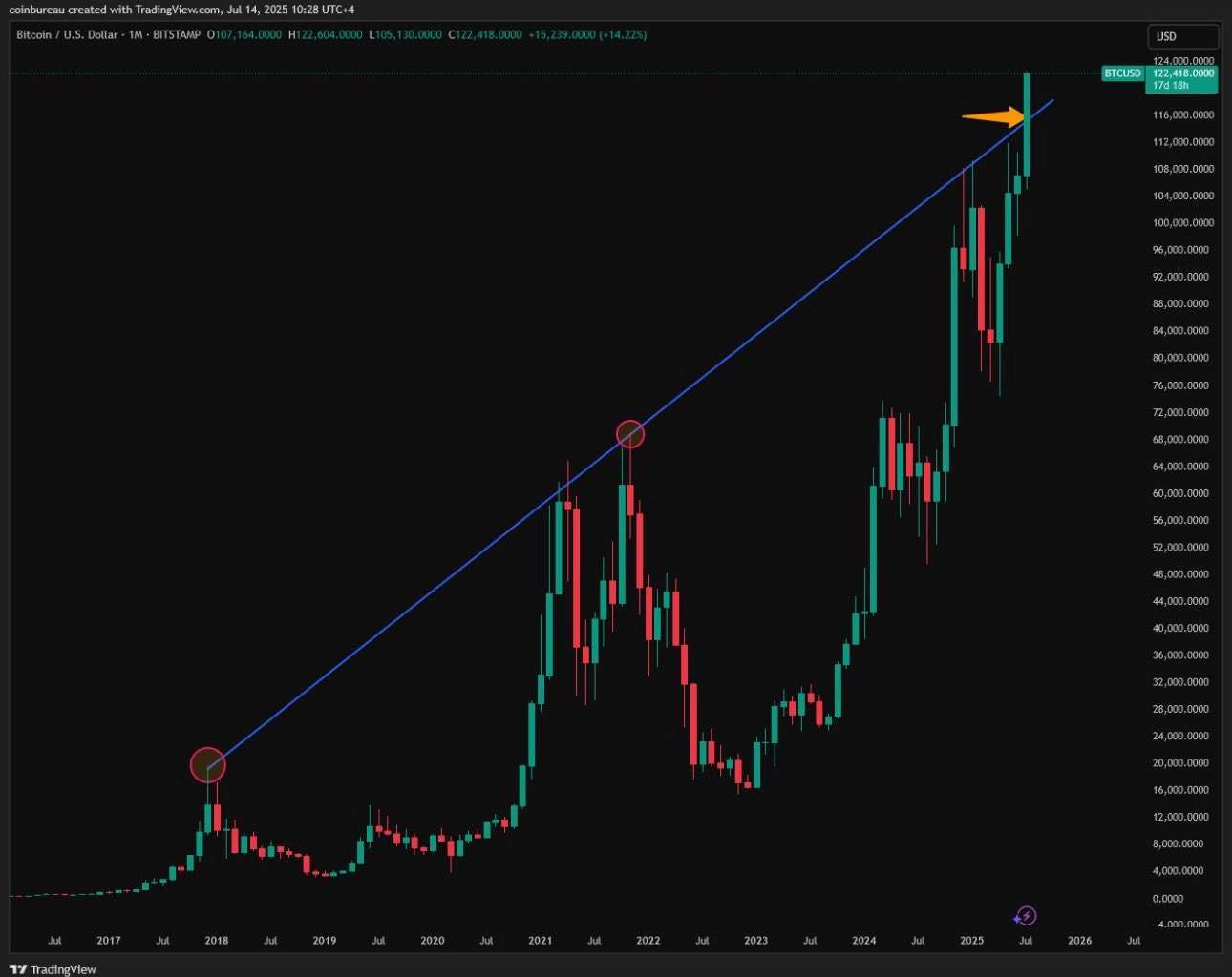 比特币完成了一项前所未有的突破 —— 在月线图上成功站上七年长期趋势线之上。这条趋势线自 2018 年以来压制了历次牛市顶部,如今正式被突破,标志着比特币迈入全新价值重估阶段。