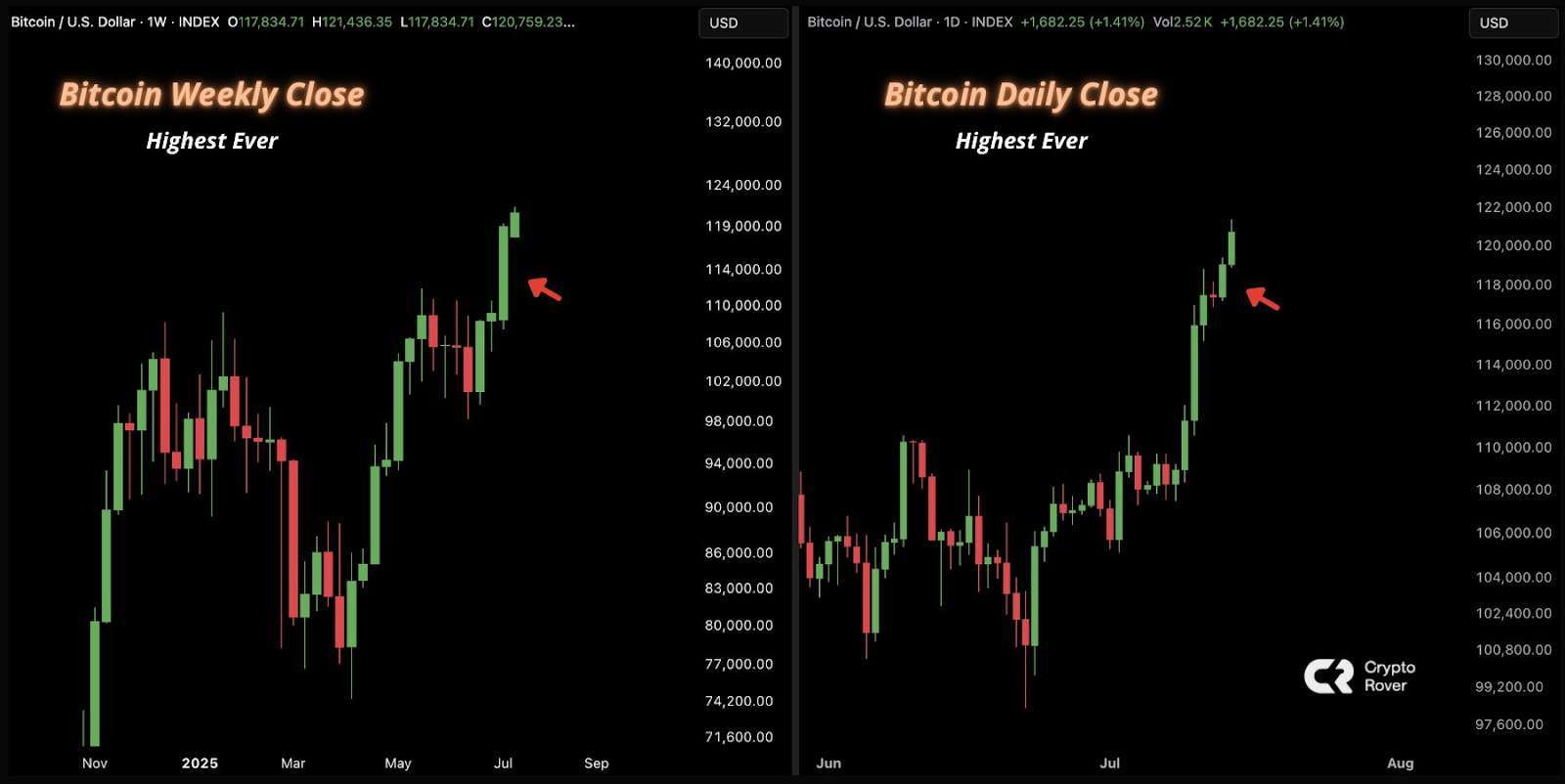 有趣的是,此轮上涨行情中,比特币同时收出历史最高的日线与周线实体K线,创下前所未有的收盘强势。