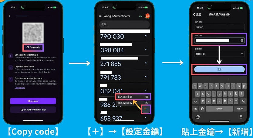 【Copy code】→切到Google 验证器【+】→【设定金钥】→贴上金钥→【新增】
