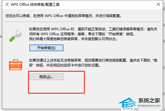 3. 来到wps软件的综合修复/配置工具窗口中,用户直接按下高级按钮。