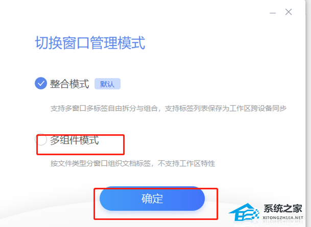 6. 随后会弹出切换窗口管理模式窗口,用户直接勾选多组件模式选项并点击确定按钮即可。