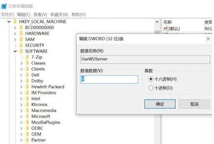 2、定位到:HKEY_LOCAL_MACHINE\SOFTWARE\Policies\Microsoft\Windows\WindowsUpdate\AU 并把usewuserver的值改为0确认