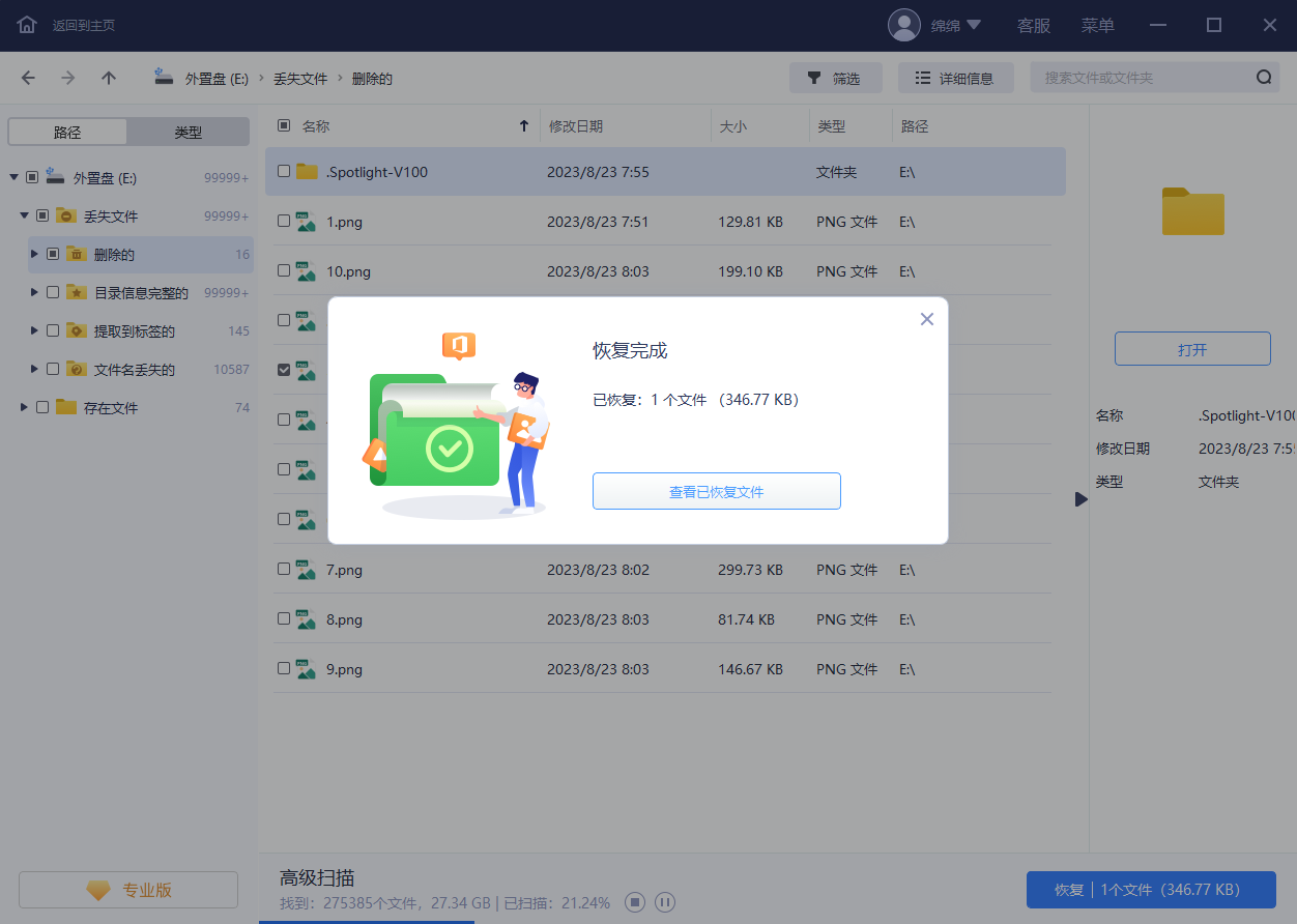 勾选移动硬盘上需要恢复的数据,执行「恢复」操作,等待数据恢复完成,将格式化数据保存在移动硬盘之外的安全设备上。