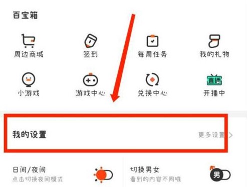 2、在个人中心下方找到切换性别上方的更多设置,点击打开。