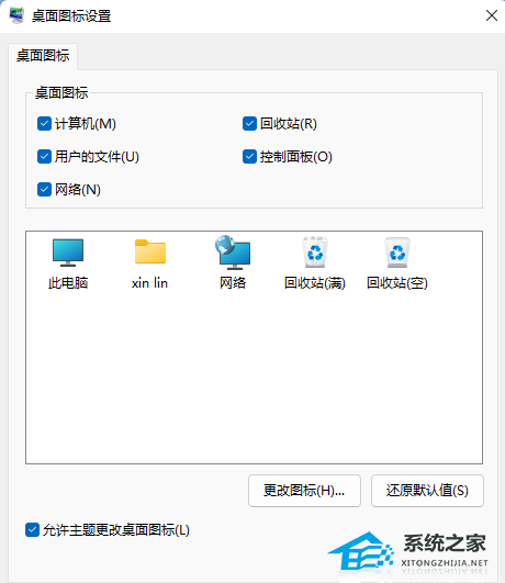 5. 桌面图标设置窗口,就可以看见各种桌面图标了,【勾选控制面板】,然后点击【应用确定】即可。