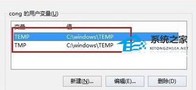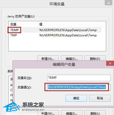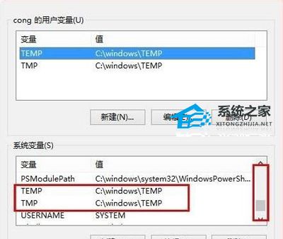 5、如下图,请找到环境变量内的的“TEMP”和“TMP”,并把里面的路径改成: