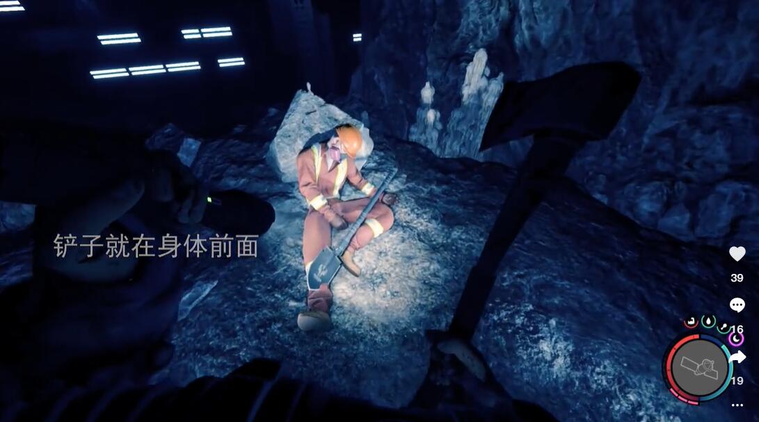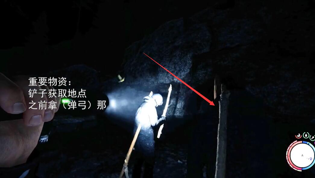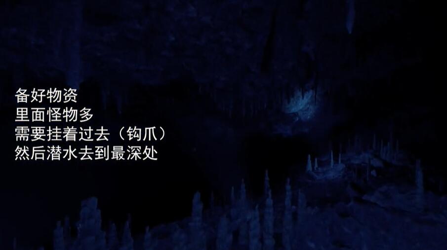 3、前往雪山下方的洞穴,挂过去,潜水下去,在最深处的尸体前方就是铲子。