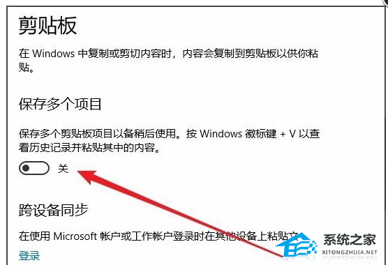 3. 在右侧的窗口中找到“保存多个项目”的设置项,可以看到下面有一个“保存多个剪贴板项目以备稍后使用。按Windows徽标键+V以查看历史记录并粘贴其中的内容”设置项;