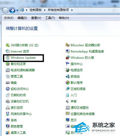 2. 打开控制面板窗口中单击”Windows Update“选项。