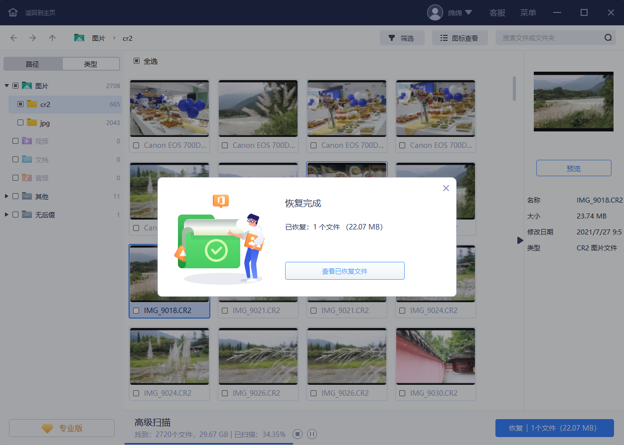 勾选内存卡上需要恢复的数据,执行「恢复」操作,等待数据恢复完成,将删除的数据保存在内存卡之外的安全设备上。