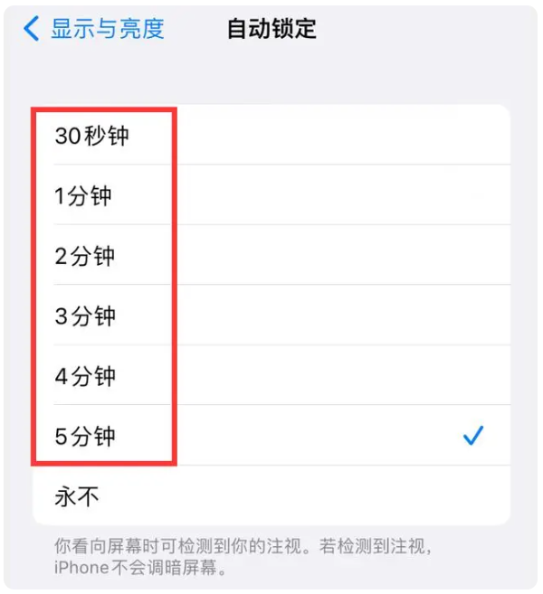 第4步:选择您想要的时间间隔,例如30秒、1分钟、2分钟等。(屏幕经过一定时间会自动熄灭)