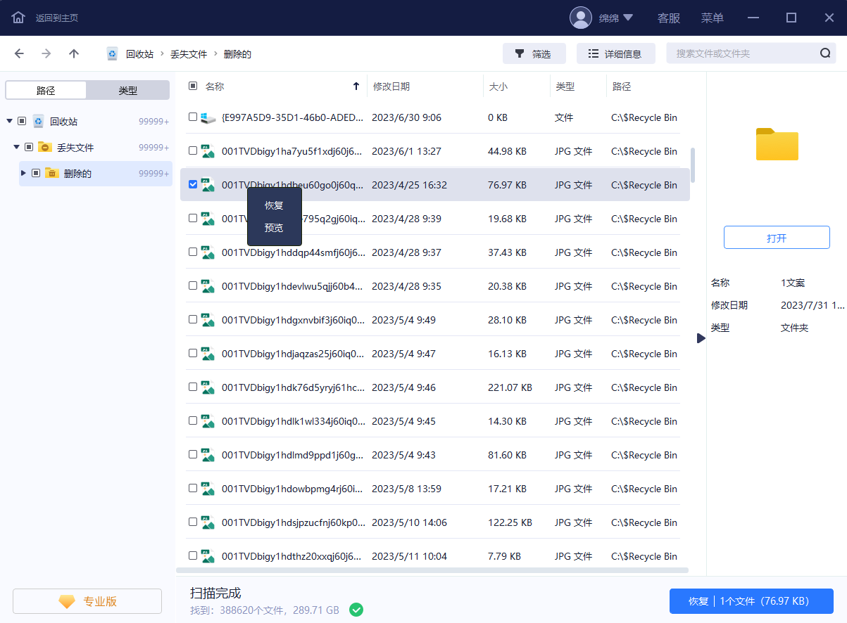 步骤3. 直接勾选需要恢复的数据,点击右下角「恢复」按钮,等待恢复操作执行完成,即可找回回收站中清空或删除的数据。注意:不要将需要恢复的数据保存到源盘,请务必保存到其它安全盘。
