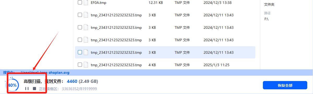 注意,如果丢失的Word文档在扫描完成之前已经找到了,你可以直接点击右下方的暂停按钮,并预览该文件是否是你需要恢复的Word文档。
