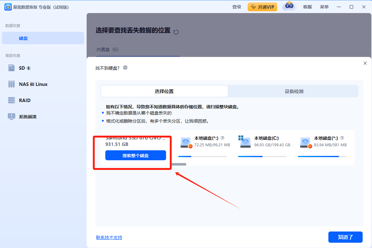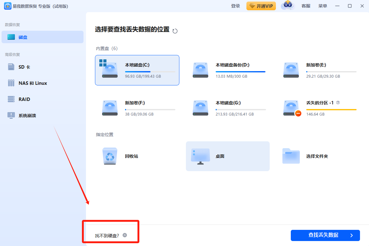 第2步:然后,选择丢失Word文档的分区进行扫描。当然,如果你不记得是在哪个分区或文件夹的话,可以点击下方【找不到硬盘?】按钮,选择【搜索整个磁盘】进行全盘扫描。如果你丢失的Word是存储在外置存储上的,记得先将该存储设备连接至电脑上。