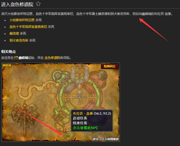 在魔兽世界中,进入血色修道院任务交付于NPC布拉贡·血拳,位于幽暗城的左下方房子里。该任务交付的NPC跟接取任务NPC是同一个,需要击杀四个任务要求的NPC后复命就可以完成该任务