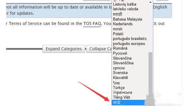 3、在右上角的语言栏中,通过下拉菜单滑到最下面选择中文,之后点击确定之后就可以成功的设置了。