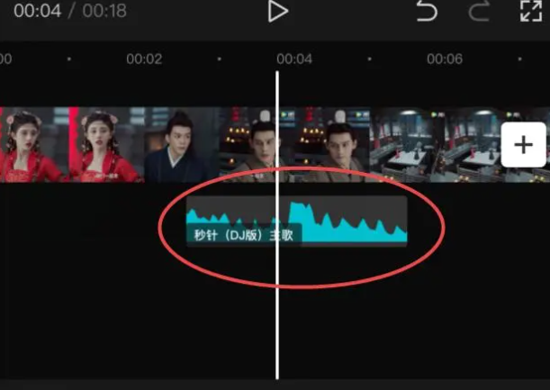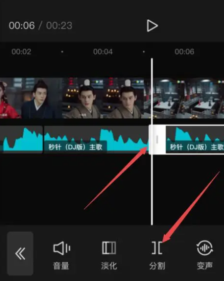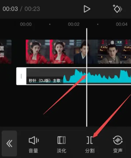 5、导入音频之后,点击选中音频素材,然后把竖向移动到需要的音频开头处,点击"分割"。