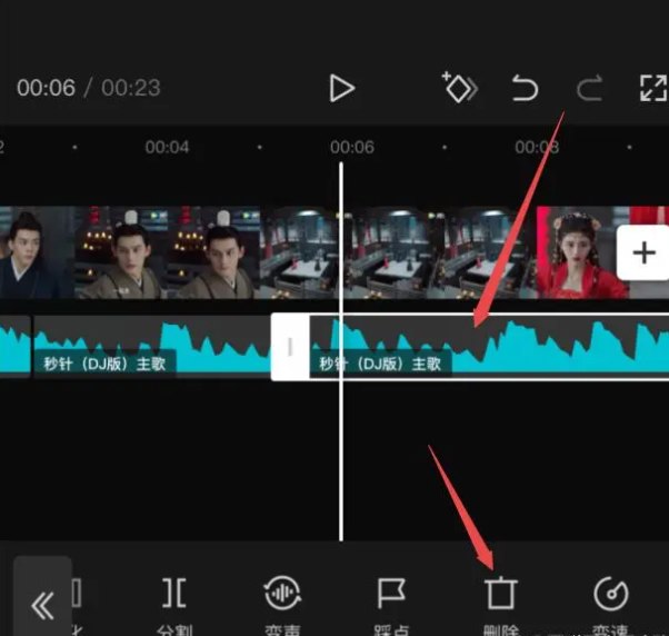 7、分别点击开头和结尾不需要的音频片段,点击"删除"