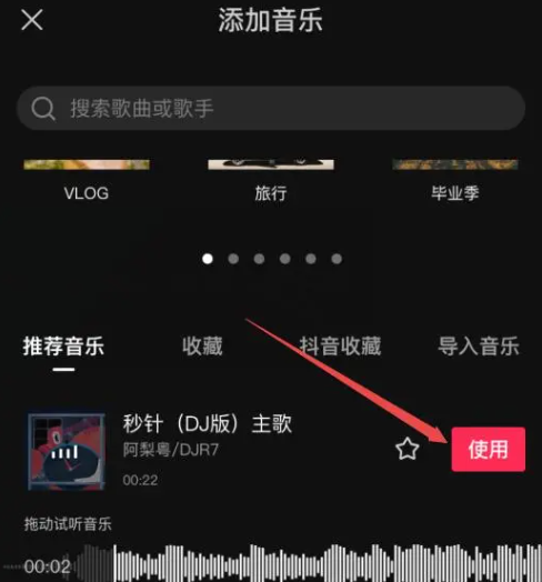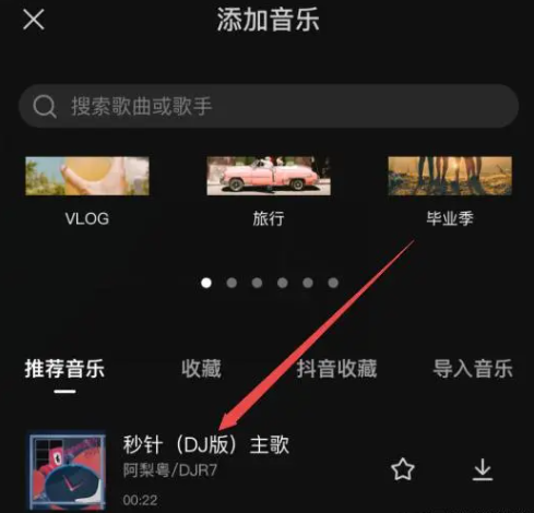 3、在添加音乐页面中,点击喜欢的音乐素材。
