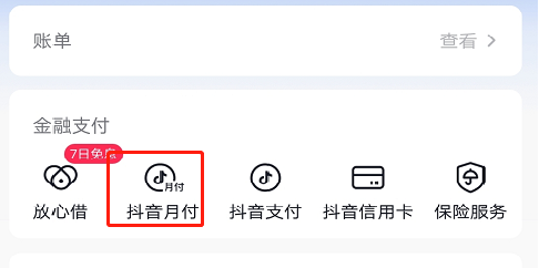 3、在金融支付模块下方,选择"抖音月付"进入,点击"立即开通"按钮;
