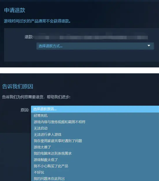 注意:steam的退款要求为游戏时间不超过2小时,购买时间不超过14天的任何游戏,不符合以上退款条件的游戏一般很难通过审核。