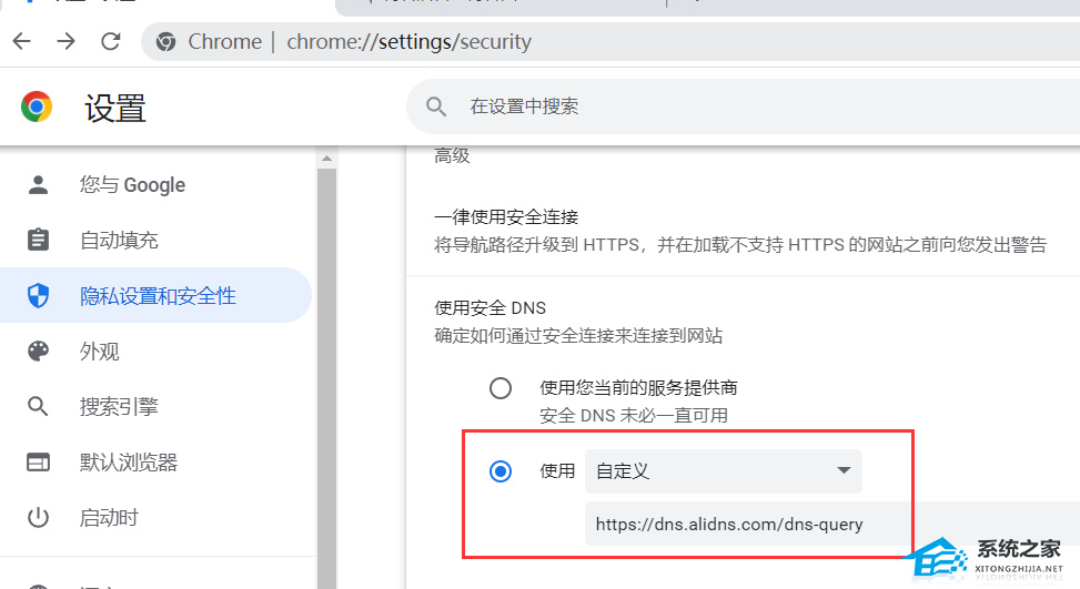 2、若不能稳定访问网站,如下图,可改变使用安全DNS选项,使用:https://dns.alidns.com/dns-query 尝试访问。