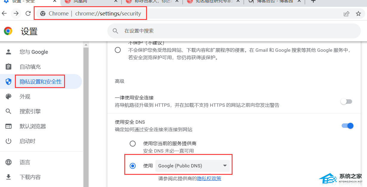 1、打开chrome浏览器,在地址输入如下指令:chrome://settings/security 出现如下界面。找到隐私设置和安全性项,在使用安全DNS选项中,选择:使用:Google(Public DNS) ,在设置后并进行测试,若能稳定访问相关网站即可。