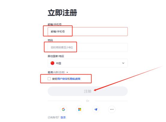 在注册页面,需要填写您的邮箱地址、密码和邀请码(如果有)。其中,密码必须包含大写字母、小写字母、数字和符号,且长度不低于8位,以确保账户安全。