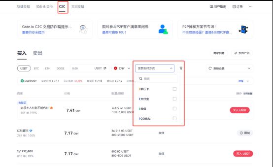 Gate.io支持C2C法币交易,以你所在国家当地的支付方式,比如银行转账,Paypal、Skrill电子钱包,LINEPay线上支付和国际电汇等。