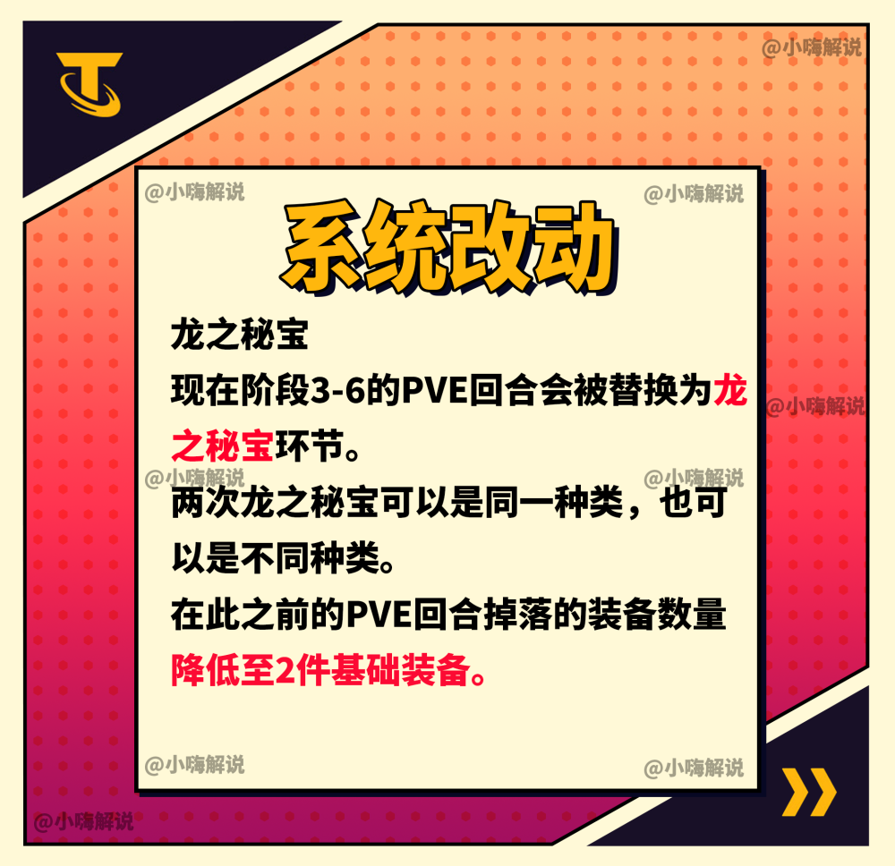 狂欢版本自然少不了狂欢,如今3-6PVE回合改为龙之秘宝,而且龙之秘宝可以是混沌秘宝龙、秩序秘宝龙以及普通秘宝龙,如果两个秘宝龙都是光明装备,那么对于主C的提升无疑最大的。