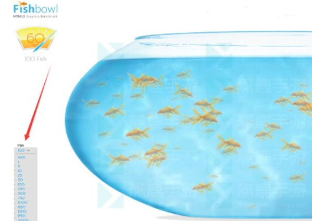 还可以设置鱼的数量,测试过程中玻璃鱼缸中的鱼是在不停游动的,在不同设备中鱼的数量相同的情况下,其游动速度越快,证明HTML5性能越强,而页面左侧也会给出相应的分值,同样,分值越高越好。