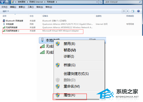 5. 右键点击“无线网络连接”,选择“属性”。